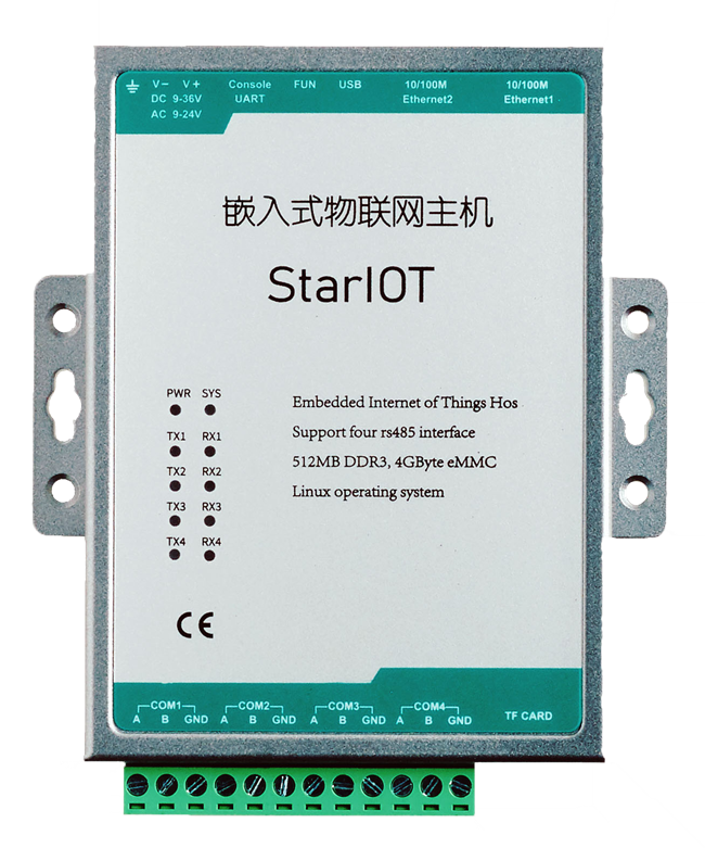 StarIOT嵌入式物联网主机采用先进的髙性能 4 核心 A9 处理器,主频高达 1.4GHz。内存采用 32 位高速DDR3 内存,能提供高速数据处理能力。
